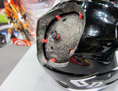 nah karet yang berwarna merah tersebut juga dapat meredap kepala saat jatuh dan kemungkinan kepala berputar di dalam helm, karena karen tersebut di design dengan pengalaman dan kebutuhan penggunaan helm motocross. Selain keuntungan di atas helm ini juga dapat mengalirkan udara segar kedalam helm, pastinya anda saat disirkuit anda akan berkeringat seperti aimancur.